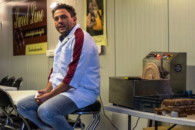Hijzelf bereidt in zijn bedrijfje zowel ijscrème als pralines en chocoladefiguren.